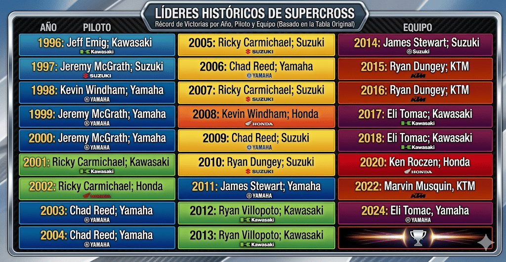 Ken Roczen no solo ganó, sino que grabó su nombre con letras de oro. Con su victoria número 26, el alemán se coloca a un solo triunfo de alcanzar a Bob Hannah en el top 10 histórico. Lo de Roczen con Suzuki ya es de otro planeta: el 50% de sus éxitos en la categoría reina han sido sobre la marca japonesa, consolidándose como el tercer máximo ganador histórico para la firma, solo detrás de leyendas como Carmichael y Barnett. Con el campeonato a tiro, Roczen sale de St. Louis a escasos 5 puntos del liderato.