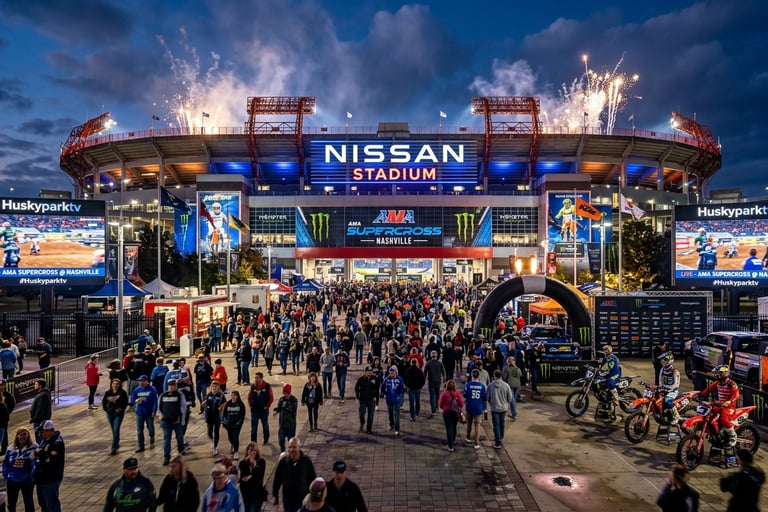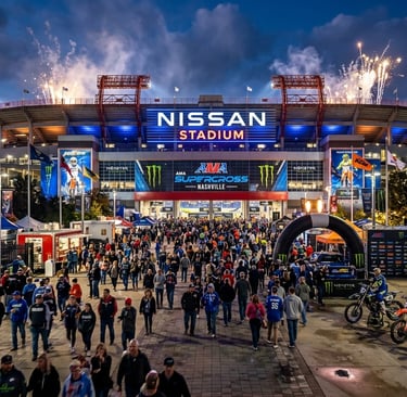 El Nissan Stadium, inaugurado en 1999 a orillas del río Cumberland, es un recinto imponente con capacidad para casi 70,000 espectadores y hogar de los Tennessee Titans de la NFL. Conocido originalmente como Adelphia Coliseum, este estadio multipropósito ha sido testigo de eventos masivos, desde festivales de música country hasta vibrantes jornadas de Supercross. Su diseño de tres niveles ofrece una visibilidad excepcional, convirtiéndolo en un escenario icónico que combina la modernidad de la "Ciudad de la Música" con la intensidad del deporte de motor de alto nivel.