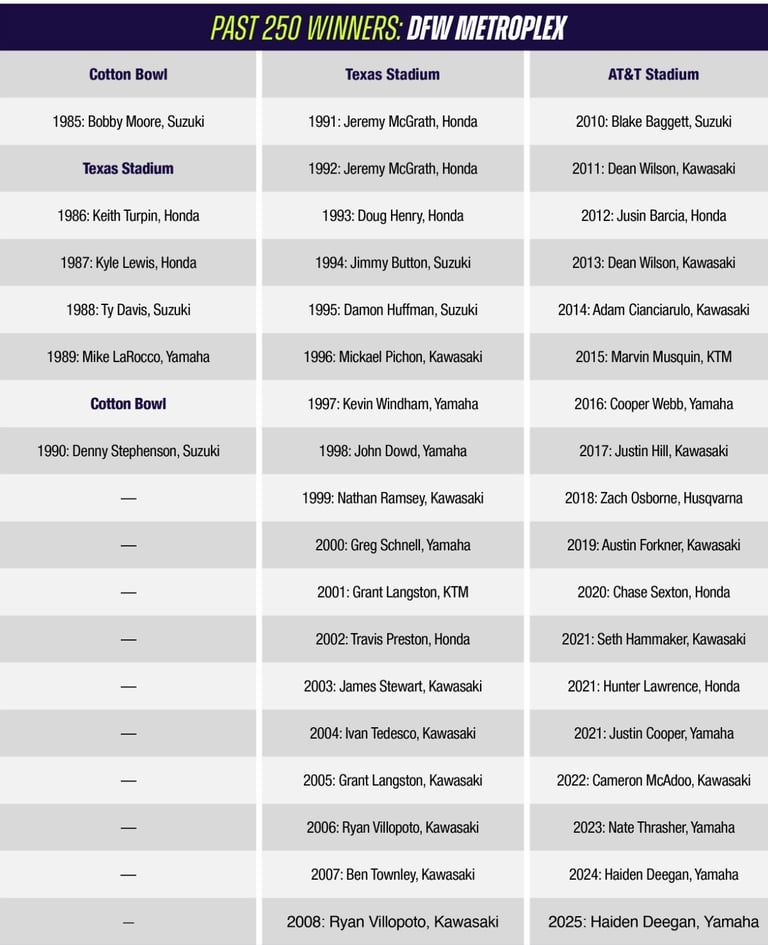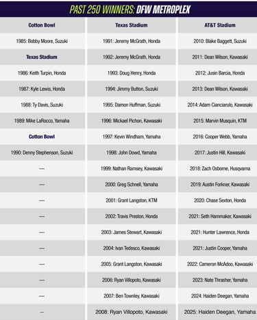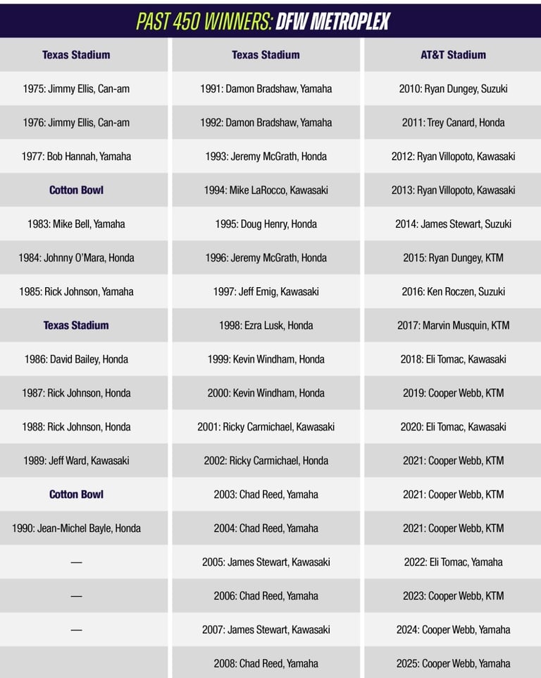 ESTADIO AT&T ARLINGTON: conocido cariñosamente (o con un toque de ironía por su tamaño) como el "Jerry World", es mucho más que un estadio de fútbol americano; es un monumento a la ambición de Jerry Jones, el dueño de los Dallas Cowboys.Arlington fue anfitrión de su primera Triple Corona en 2020, y Eli Tomac ganó la general. Arlington organizó 3 rondas durante la temporada 2021 alterada por el covid, y fue un barrido limpio por el eventual campeón Cooper Webb. Arlington recibió Triples Coronas de nuevo en 2022-2023 con Tomac y Webb ganando. 2025 también fue una Triple Corona que Webb ganó para extender su ventaja de todos los tiempos en victorias de la clase DFW 450SX por 3 victorias completas sobre Chad Reed. Webb, que ha ganado 7 de los últimos 9 aquí, es el único atleta de cualquiera de las clases en ganar 3 seguidos en DFW, y lo ha hecho dos veces. Sin embargo, 2026 no es un formato de Triple Corona.