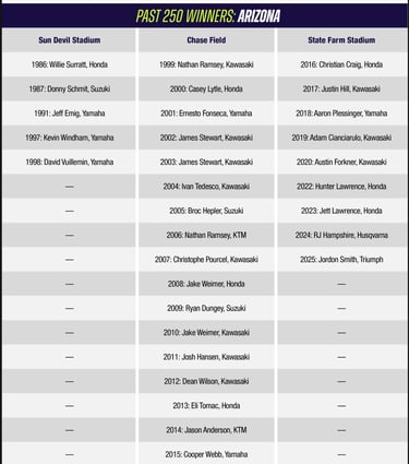 CAMERON MCADOO: El tercer podio de la temporada empata Shane McElrath y RJHampshire ubicándose de tercero en la lista de podios de la clase 250SX de todos los tiempos con 26. También empató con Ryan Clark por 26 en todos los tiempos La lista de la clase 250SX posee 57 eventos finalesEl resultado de McAdoo en Glendale fue excelente para ubicarse entre los 5 mejores de la Liga SM con 30*.