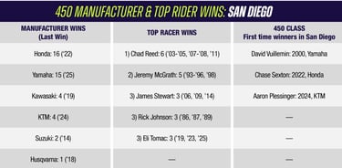 Entramos a la segunda da fecha del AMA Súpercross y nos trasladamos a la zona sureste del estado California en la ciudad de San Diego en el nuevo estadio Snapdragon , hogar de los aztecas de San Diego, fue construido cerca del sitio de The Murph y se inauguró en 2022. Se Han celebrado mas de 64 veces en albergar una ronda 450SX del Súpercross. En 2023, Eli Tomac ganó el primer evento principal en Snapdragon, mientras que Aaron Plessinger se robó el espectáculo con su primera victoria en la clase 450SX en la edición del 2024.