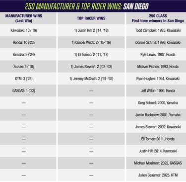 MAX ANSTIE: Obtuvo su cuarta victoria en la clase 250SX en dos divisiones y ha ganado dos veces consecutivamente en una apertura. También ganó el Apertura de la División Este de 2025 en Tampa. Es el atleta que se ubica En la posición 15 de por vida de la 250SX en ganar aperturas consecutivas, y solo el 6to. para hacerlo en costas alternas. También se convierte en el más viejo Ganador de la clase 250SX en la historia de la clase, rompiendo el récord anterior de John Dowd por 1 día (Dowd- 32 años, Smos, 15 días; Anstie- 32 años, 8 meses, 16 días).