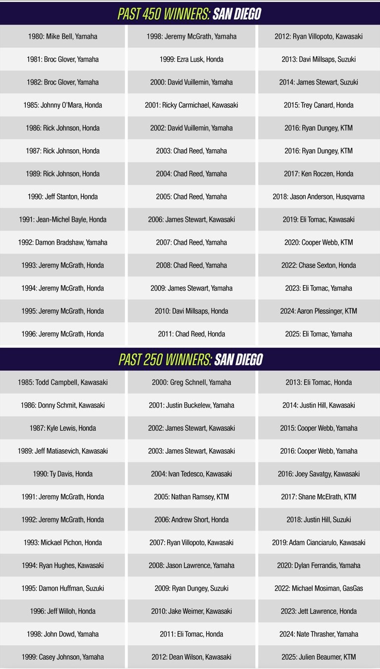 NOTAS: Haiden Deegan 4to. En la carrera de apertura en Anaheim 1 . A pesar de que no terminó en el podio, ha sido su mejor resultado comparado en sus dos anteriores finales de Apertura de la División. Ha conquistado su salida 30 de la 250SX además hizo en 23 ocasiones estar en la final entre los 5 primeros. Busca su 75 apariciones de la Liga SMX y su 50 podio de la SMX en San Diego.Michael Mosiman (5): impresionado por recoger en las final una posición de cinco ; después de ganar el LCQ. Él busca su 60 apariciones en su carrera profesional en la 250SX y 25t top-5 en San Diego. Posse 115 salidas en la SMX.Levi Kitchen : Obtuvo la sexta pos jornada en A 1 Ha completado 25 apariciones en la clase 250SX y su carrera en la Liga SMX con 80.