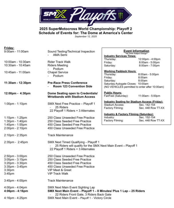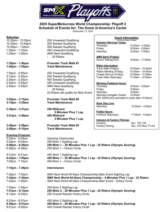 La segunda fecha de los Playoffs del SúperMotocross se llevará a cabo en The Dome at America's Center en St. Louis, Missouri. Este evento es crucial, ya que marca el punto intermedio de la postemporada, que consta de dos rondas de playoffs y una final del campeonato mundial.