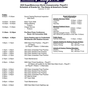 El Dome at America's Center ha acogido numerosas convenciones importantes, ferias comerciales y exposiciones, así como eventos tan variados como conciertos de rock, carreras de motocross y el súper MONSTRUO TRUCK. En 1999, The Dome at America's Center acogió una misa celebrada por el Papa Juan Pablo II, que fue la reunión interior más grande jamás celebrada en los Estados Unidos. La instalación también ha albergado una serie de eventos deportivos aficionados y profesionales a gran escala, incluida la NCAA® Men's Final Four® de 2005.Este fin de semana el majestuoso estadio techado recobrará los 44 mejores pilotos de los Estados Unidos para medirse en la segunda fecha de los PLAYOFF del Supermotcross 2025.