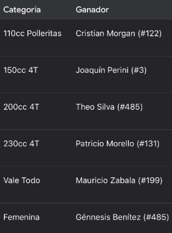 Finalmente, no podemos dejar de mencionar la clase femenina en donde la numero uno #12 Guadalupe quien vino a esta primera fecha con su nuevo equipo triumph logrando llevarse la fecha; aunque tuvo que luchar con la rapidísima #7 Yoseline Altamirano donde amabas consagraron una manga, pero Guadalupe fue la más favorecida sin olvidarnos de la gran piloto que viene en ascenso #111 María Menichetti que logro llevarse la tercera casilla.